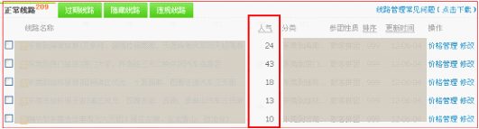 2.網(wǎng)店操作后臺(tái)(點(diǎn)擊下面的截圖中的“人氣”兩字,可以使線路按照人氣值從高到低或者是從低到高進(jìn)行排序):