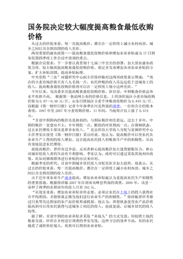 國(guó)務(wù)院決定較大幅度提高糧食最低收購(gòu)價(jià)格