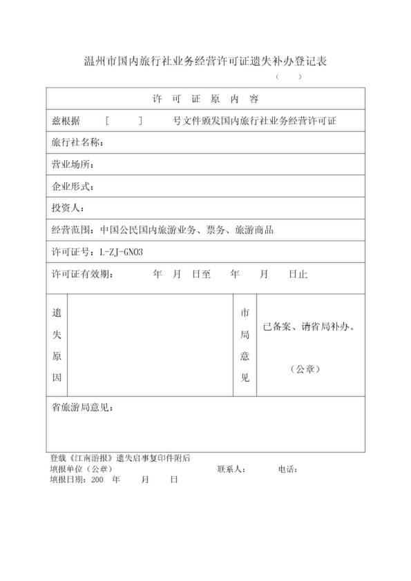 溫州市國內(nèi)旅行社業(yè)務(wù)經(jīng)營許可證遺失補(bǔ)辦登記表